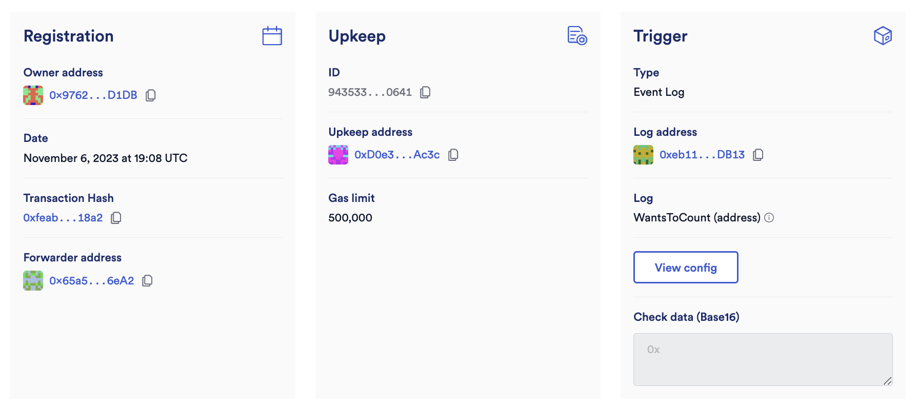 . Under Write Contract, click the button to emitCountLog. Refresh the upkeep details page. You may have to wait a few moments. Under History, you should see the upkeep has been performed.