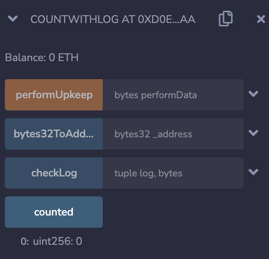 . Click the count button to view the value of the count variable. It should be 0. - Copy the address of this contract either via Remix or Etherscan to register it on the Chainlink Automation app.