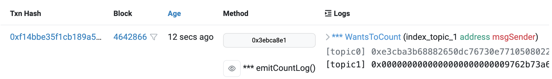 - Click Write Contract and click the emitCountLog button to emit a log.