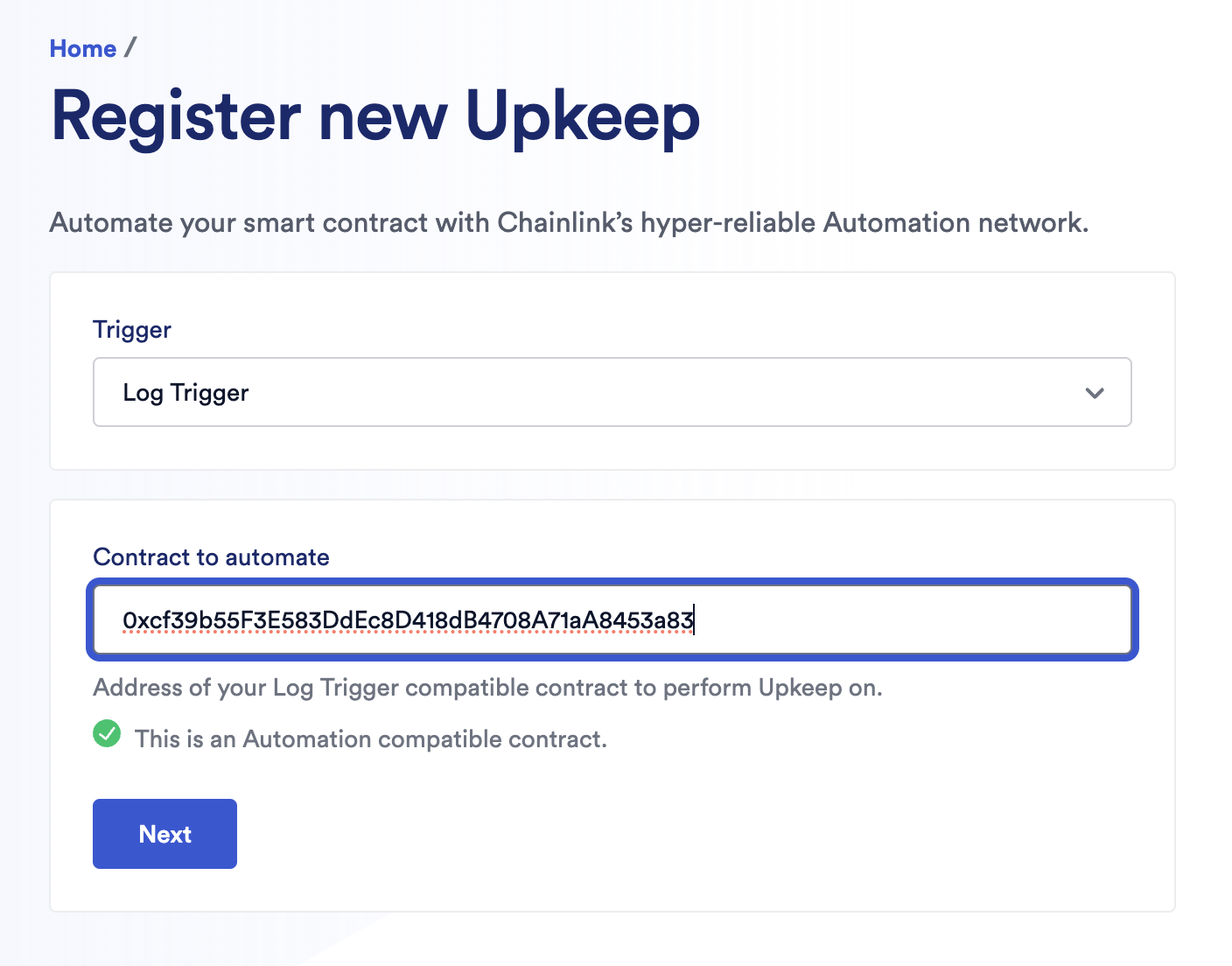 Provide the address of your Automation-compatible contract that you want to automate. In this case, we will paste the address of